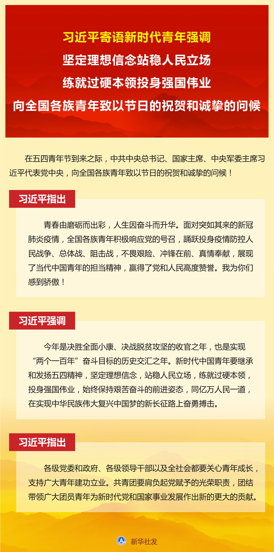 习近平强调,今年是决胜全面小康、决战脱贫攻坚的收官之年,也是实现“两个一百年”奋斗目标的历史交汇之年。新时代中国青年要继承和发扬五四精神,坚定理想信念,站稳人民立场,练就过硬本领,投身强国伟业,始终保持艰苦奋斗的前进姿态,同亿万人民一道,在实现中华民族伟大复兴中国梦的新长征路上奋勇搏击。